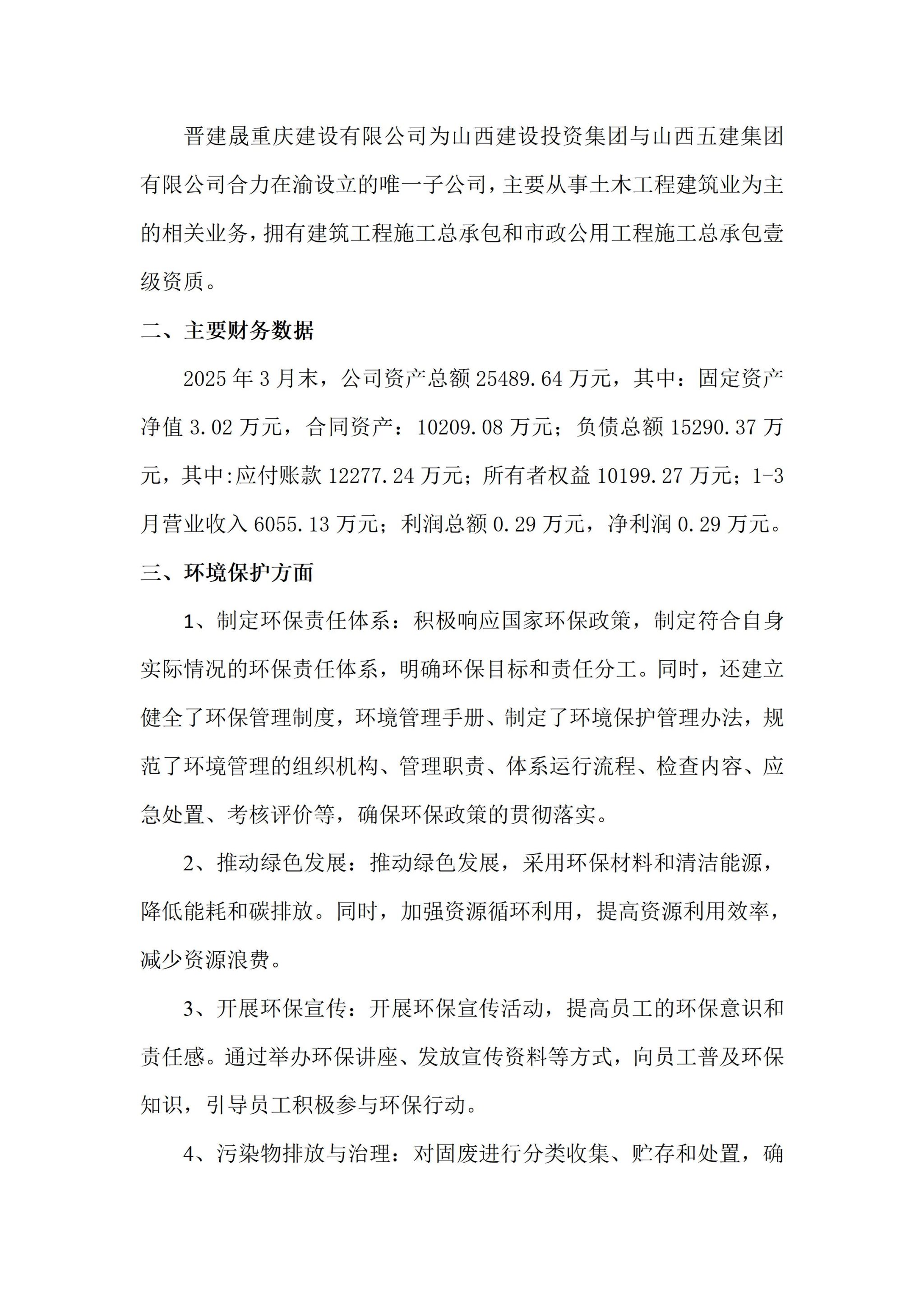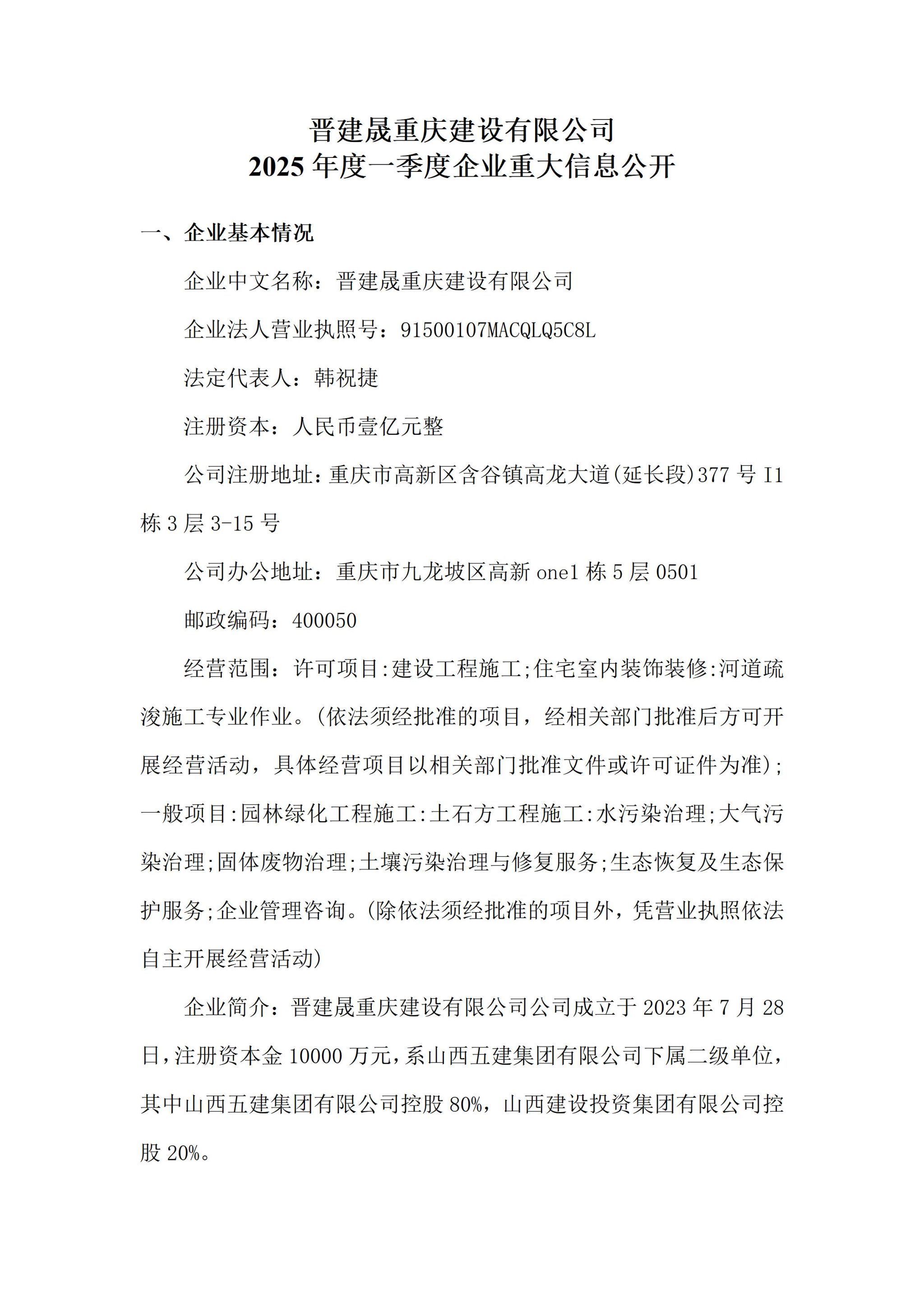 晋建晟重庆建设有限公司2025年一季度企业重大信息公开