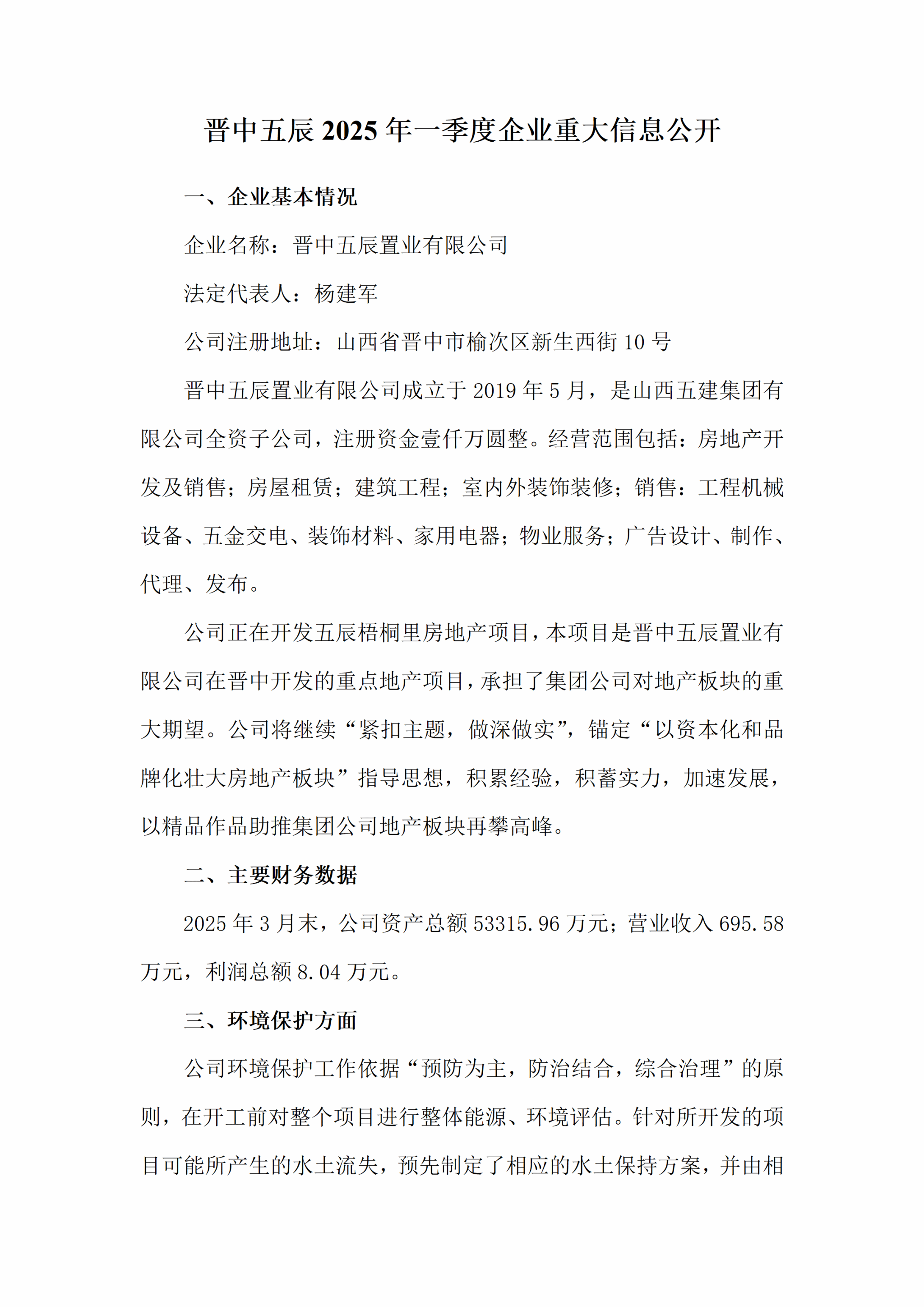 晋中五辰置业有限公司2025年一季度企业重大信息公开