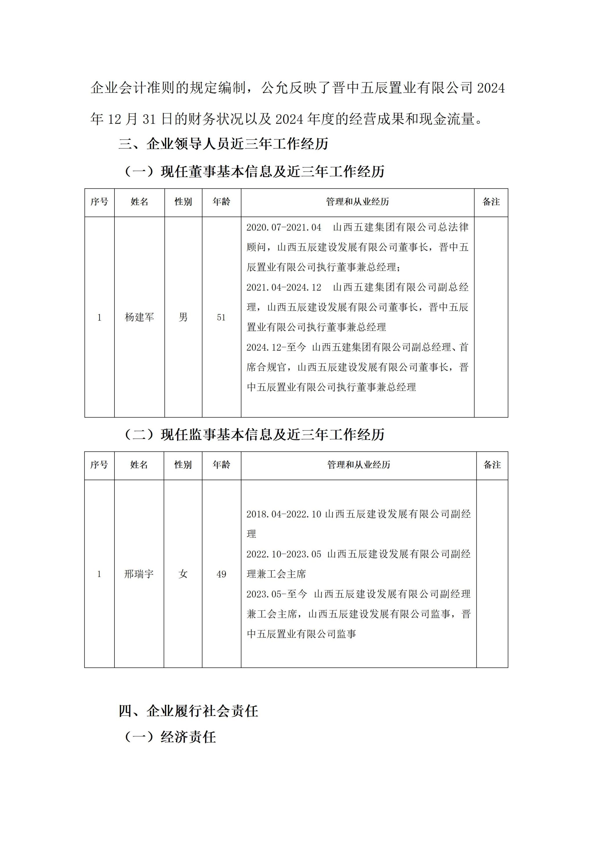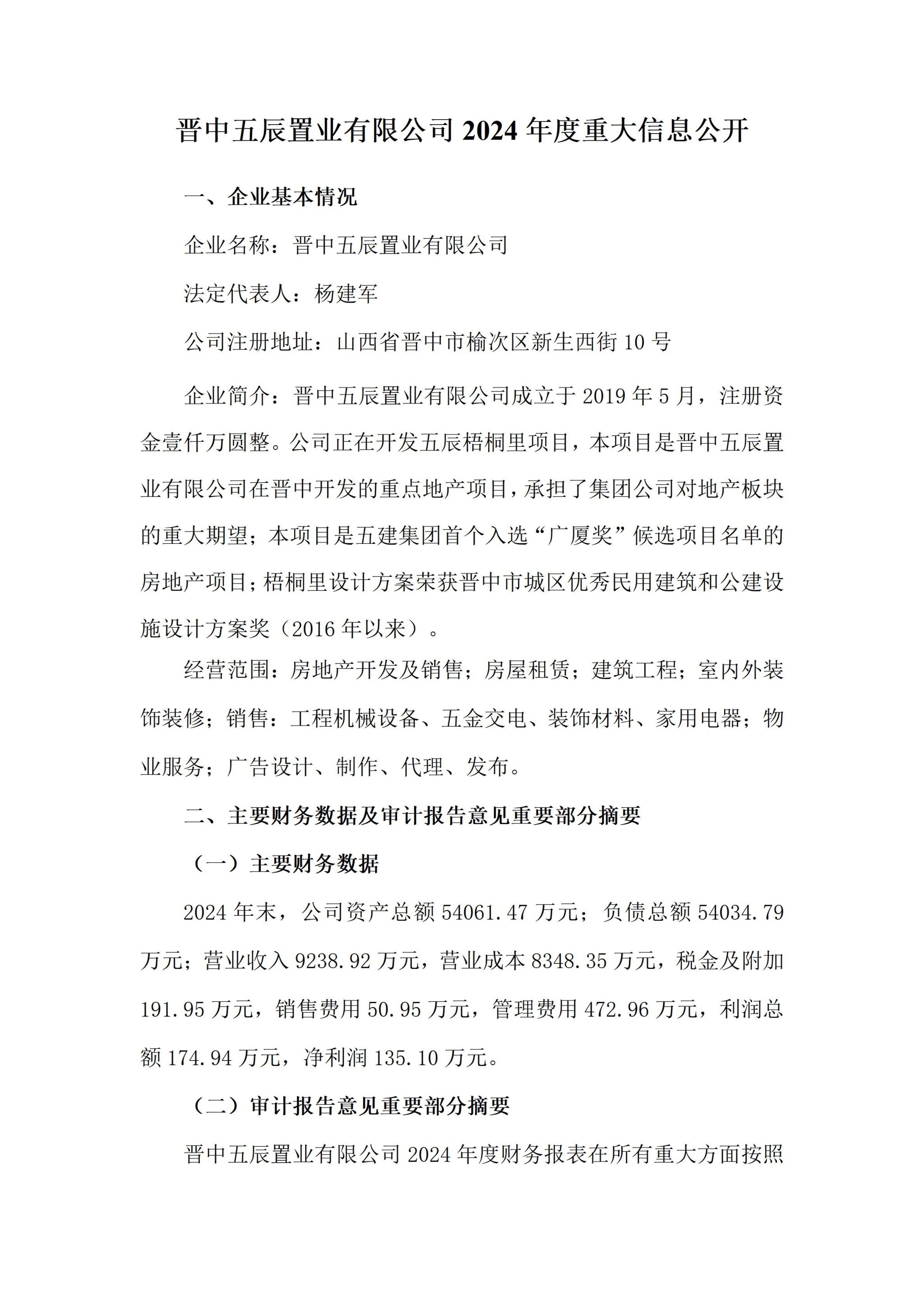 晋中五辰置业有限公司2024年度企业重大信息公开