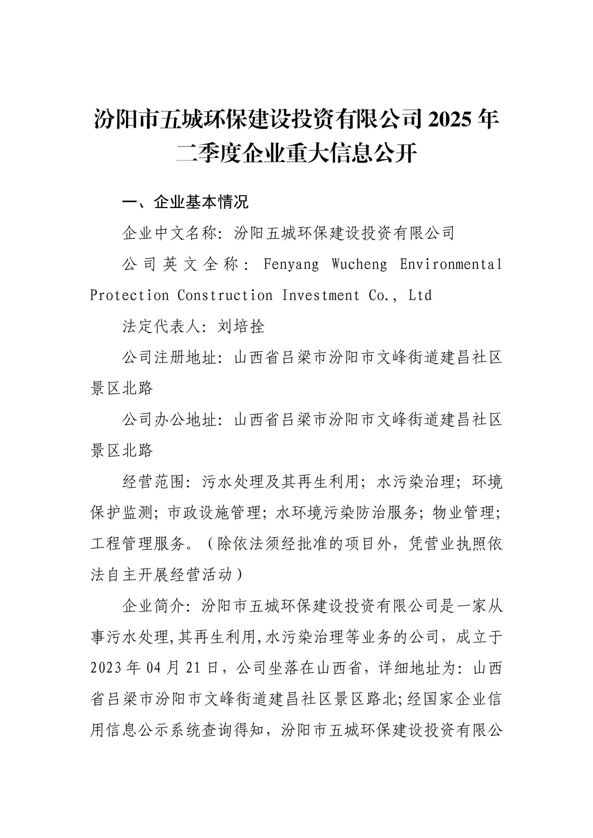 汾阳五城环保建设投资有限公司2025年二季度企业重大信息公开