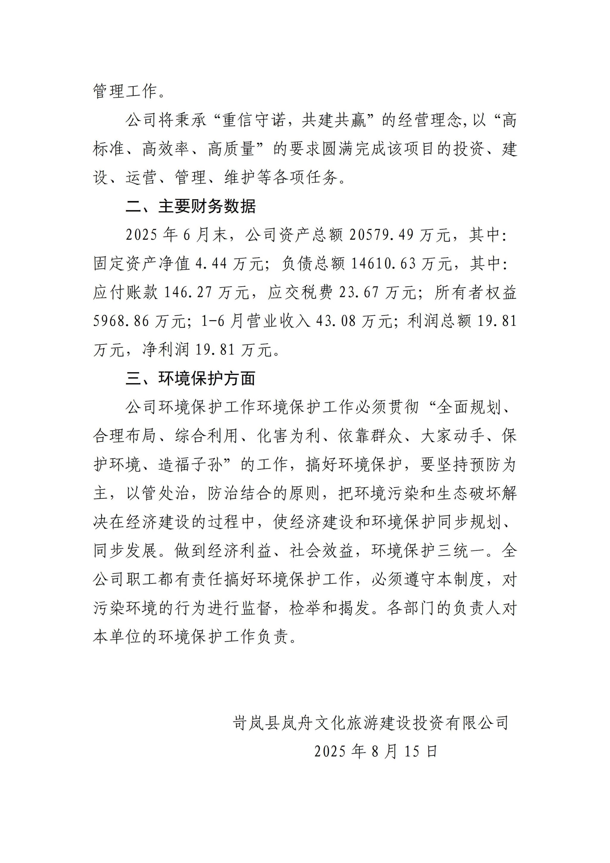岢岚县岚舟文化旅游建设投资有限公司2025年第二季度企业重大信息公开