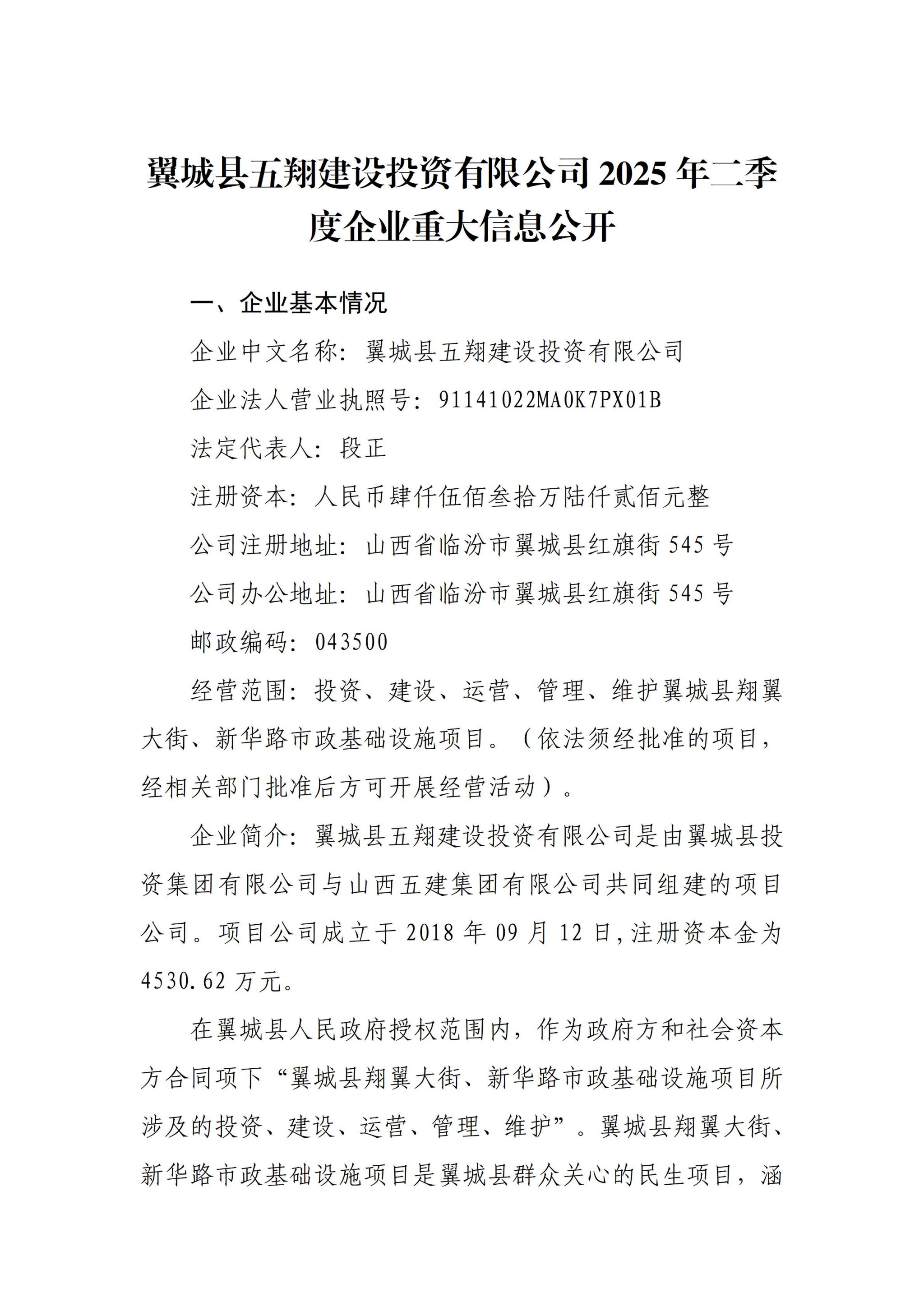 翼城县五翔建设投资有限公司2025年二季度企业重大信息公开