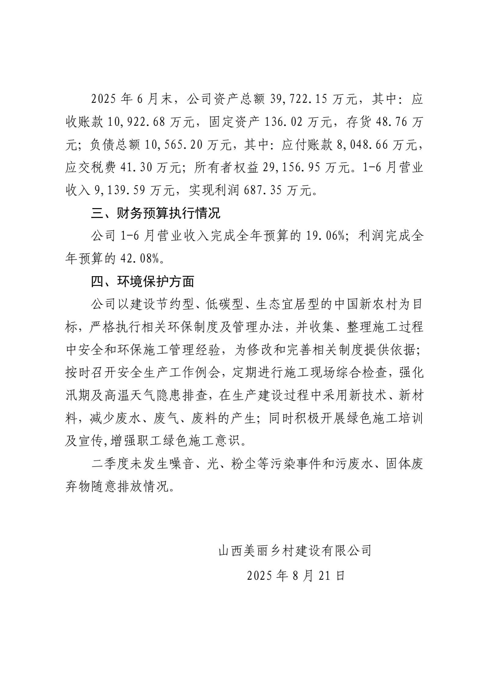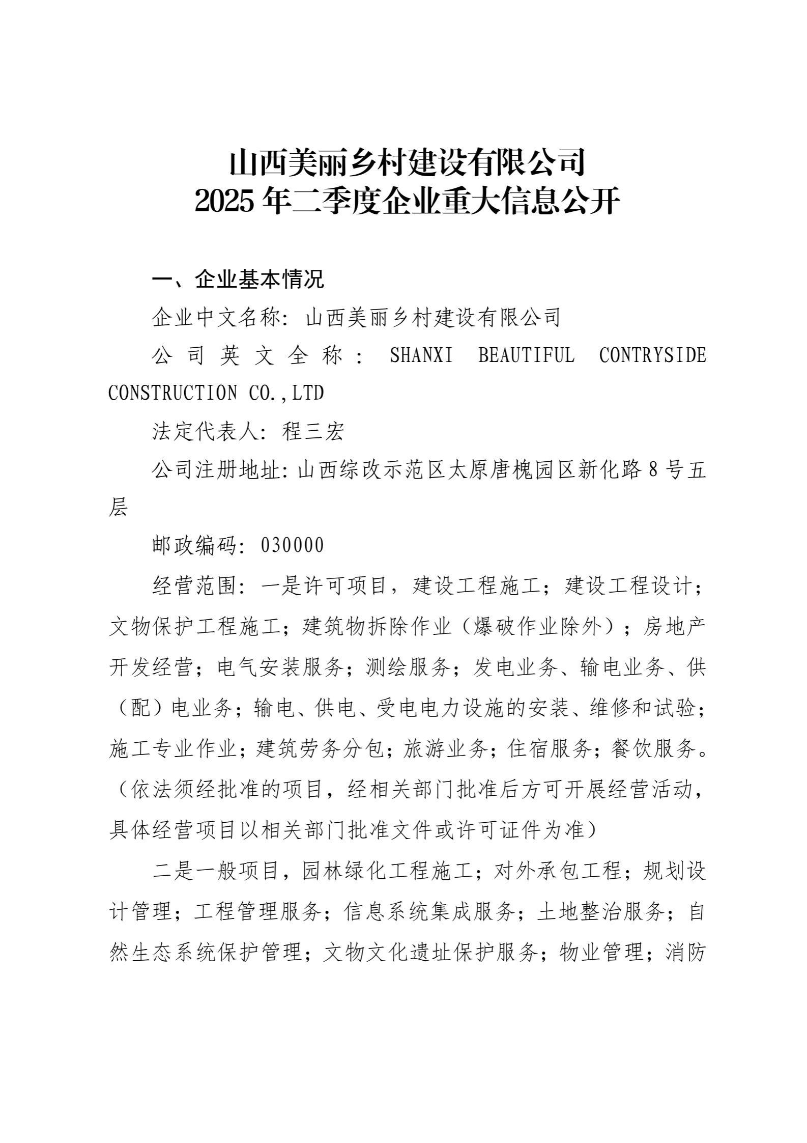 山西美丽乡村建设有限公司2025年二季度企业重大信息公开