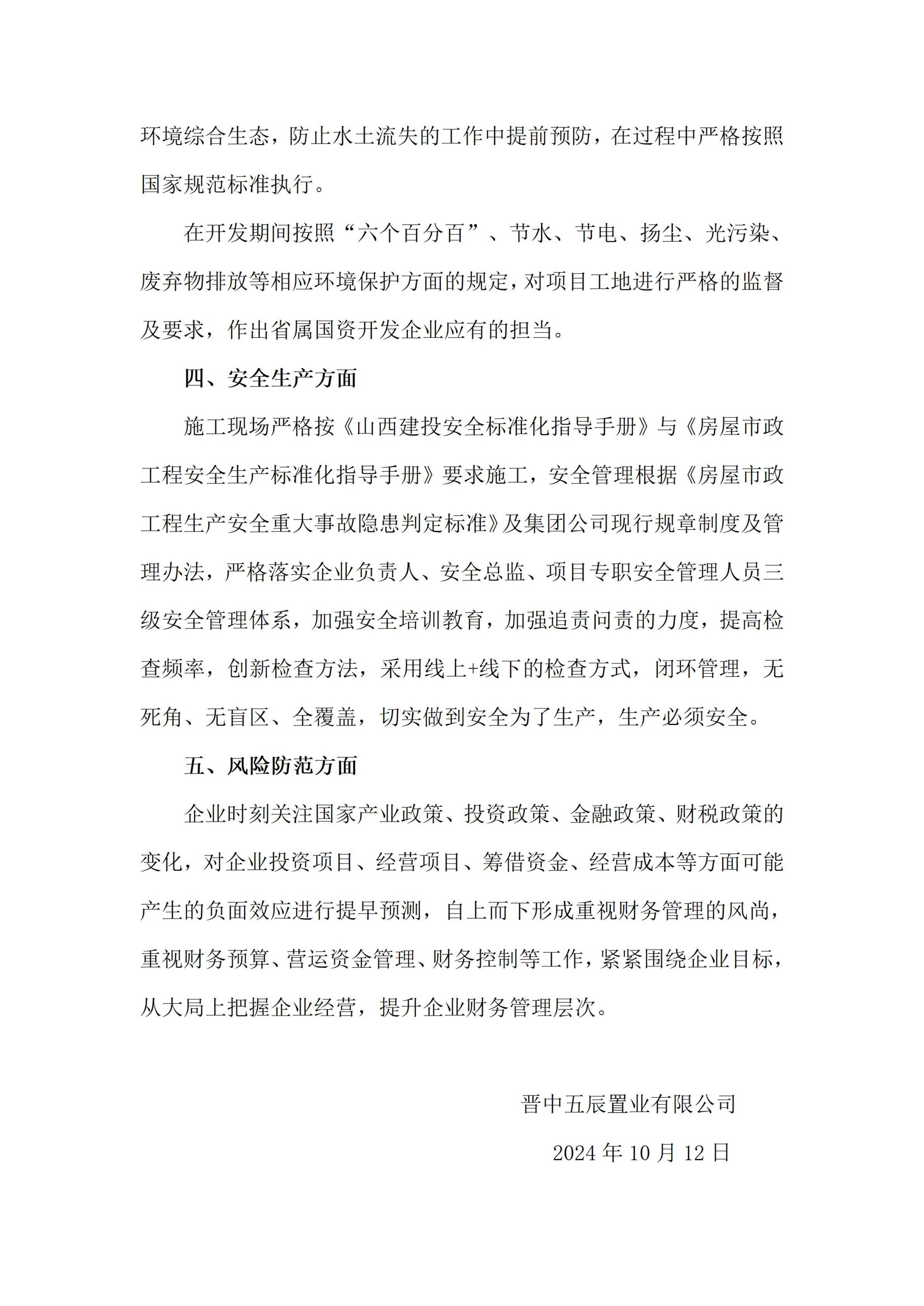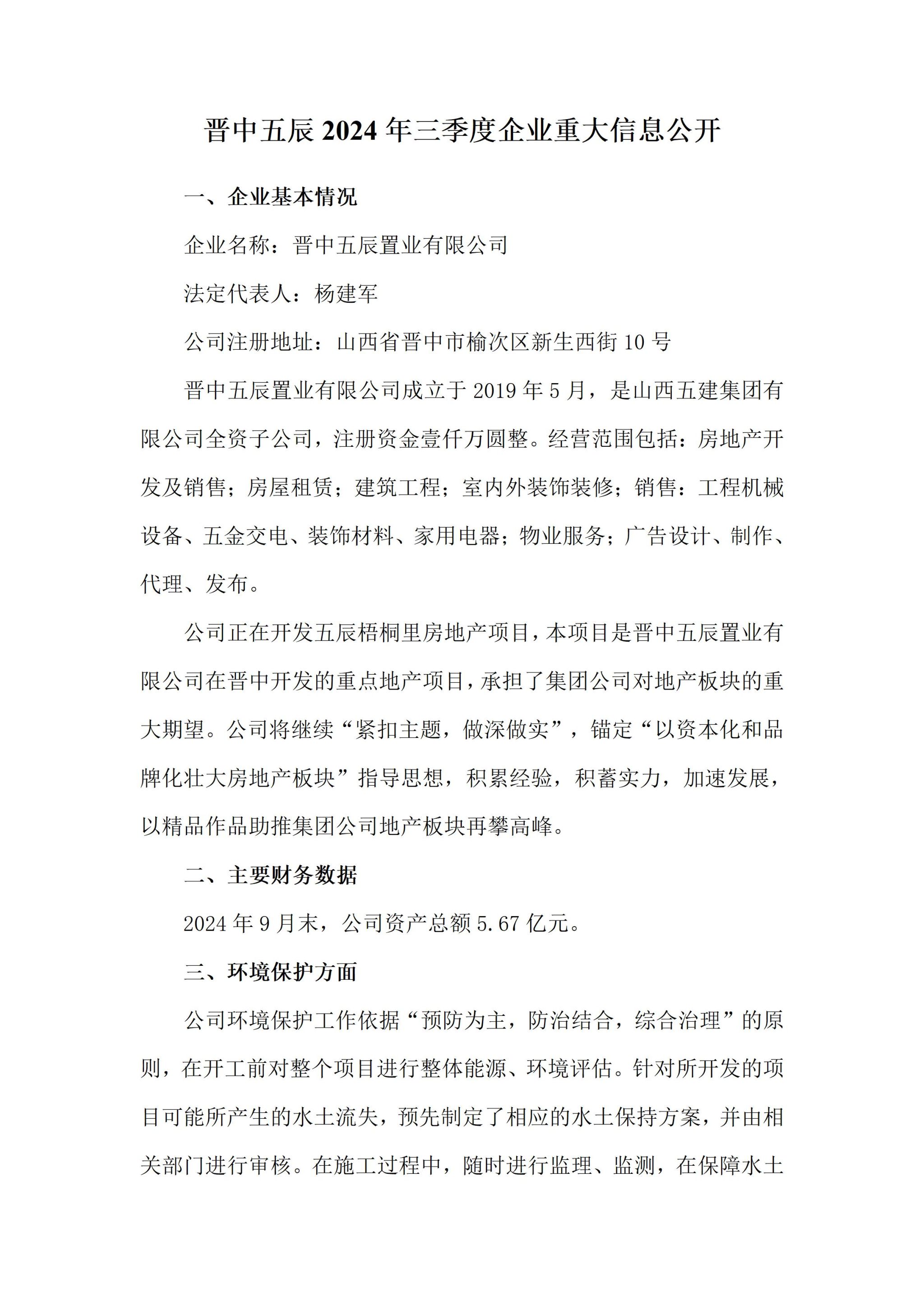 晋中五辰置业有限公司2024年三季度企业重大信息公开