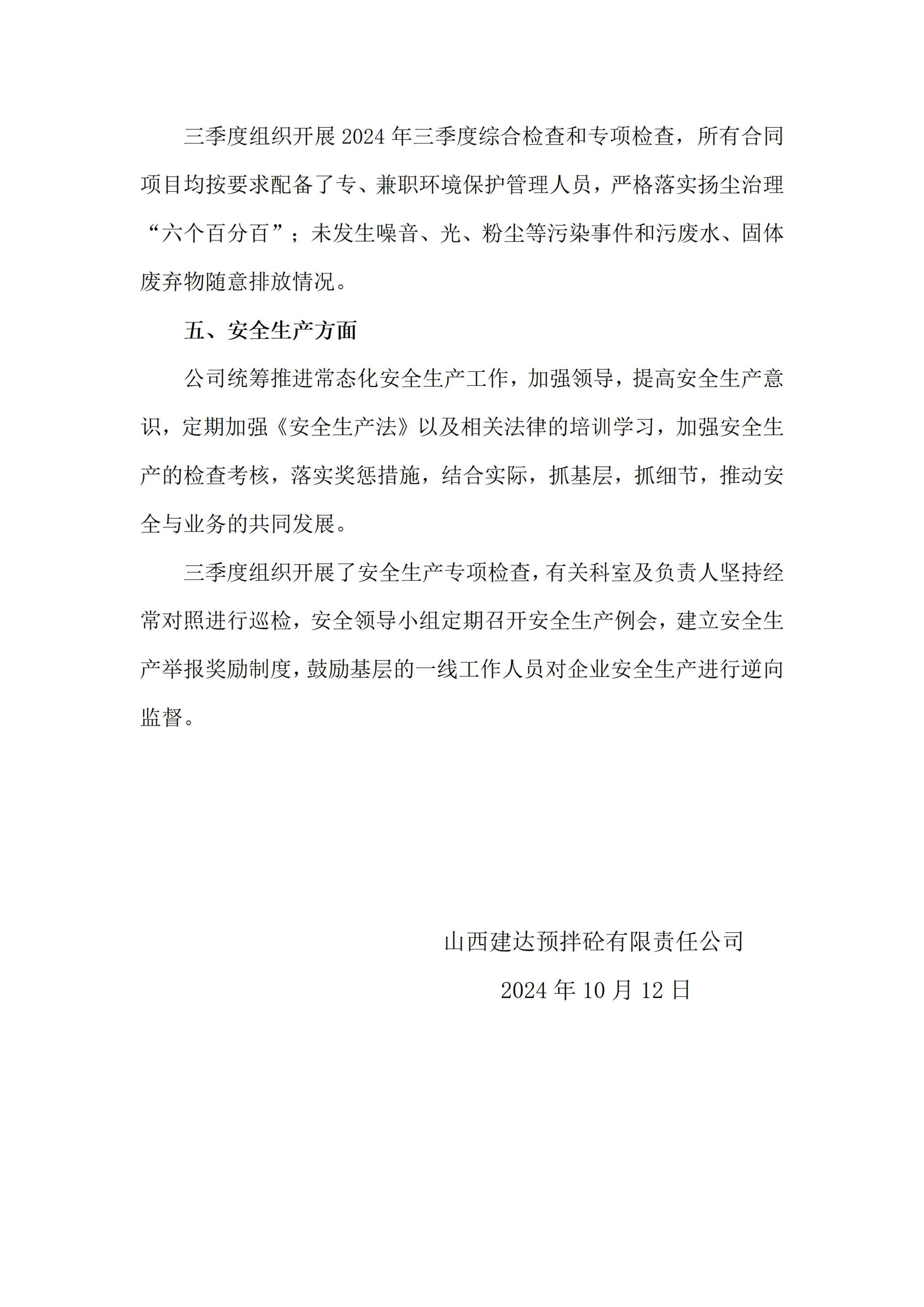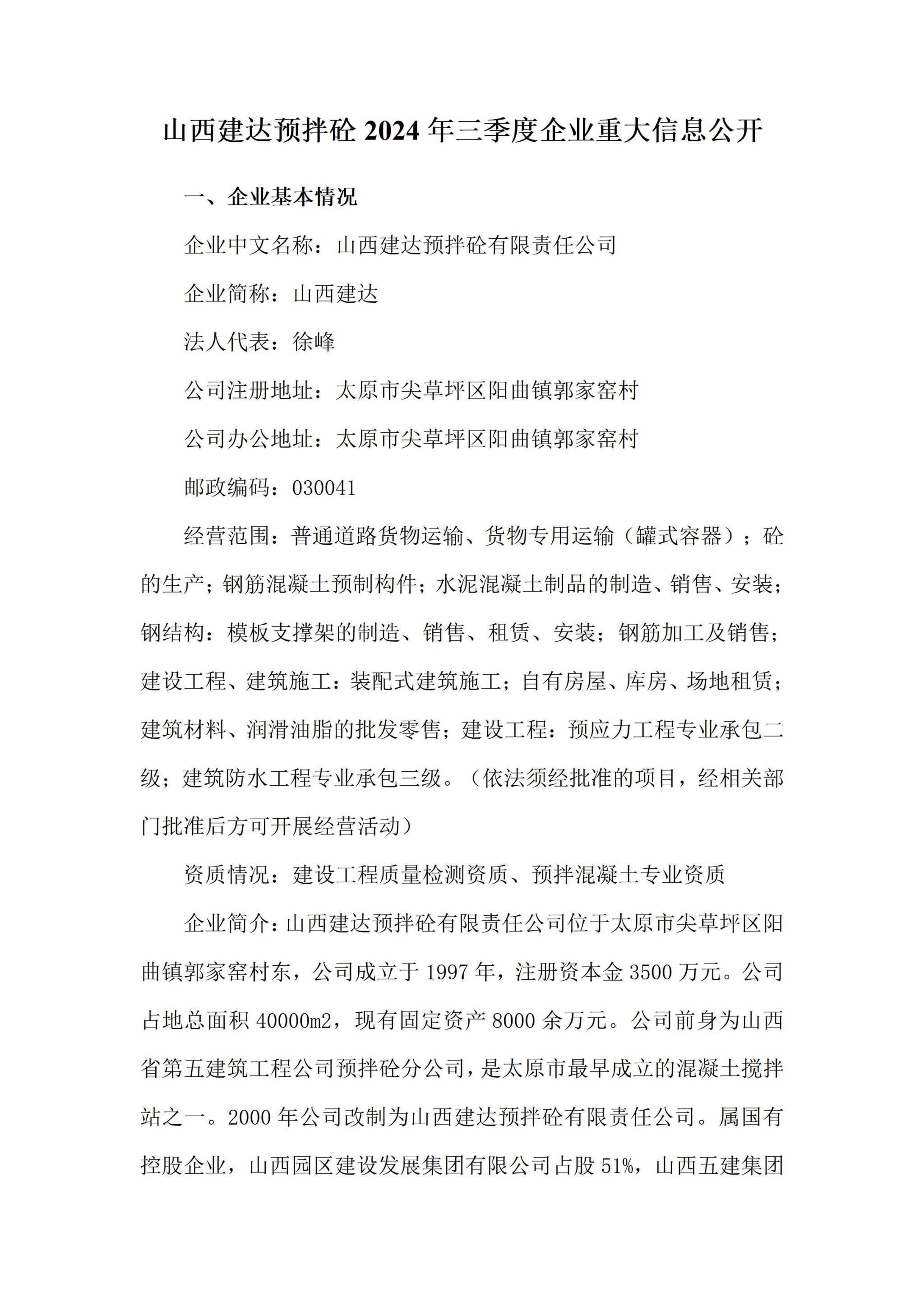 山西建达预拌砼有限责任公司2024年三季度企业重大信息公开
