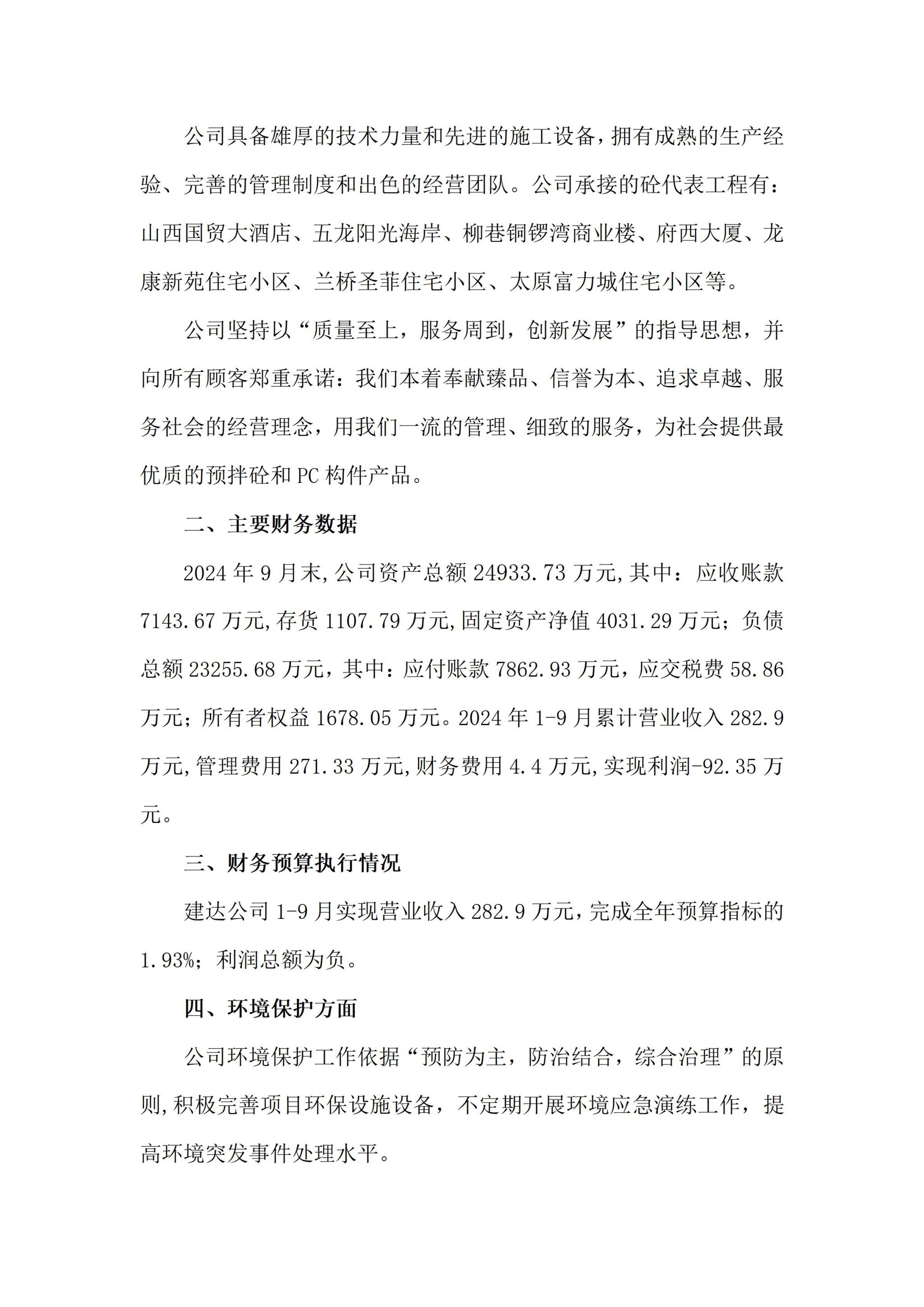 山西建投晋西北建筑产业有限公司2024年三季度重大信息公开