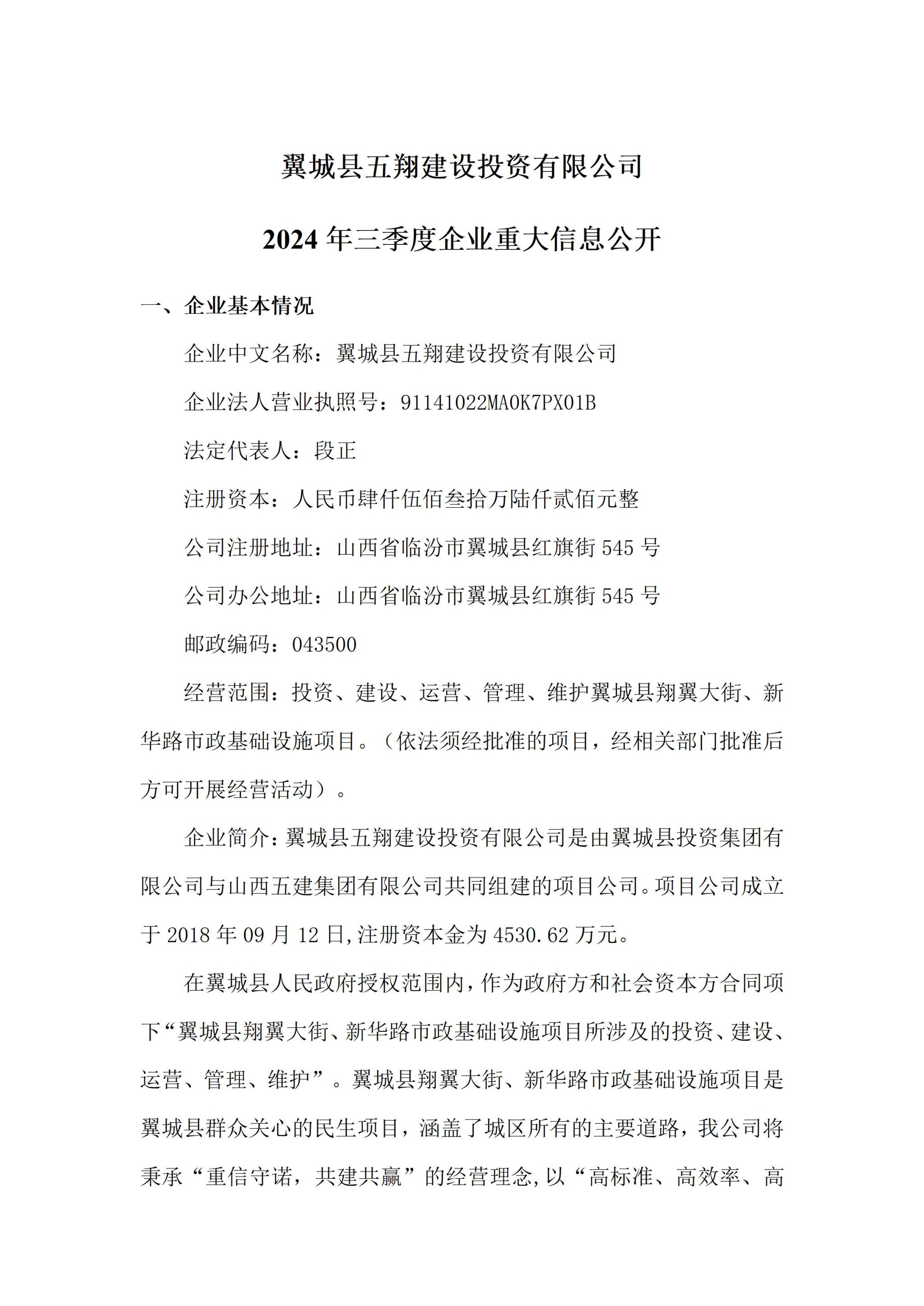 翼城县五翔建设投资有限公司2024年三季度企业重大信息公开